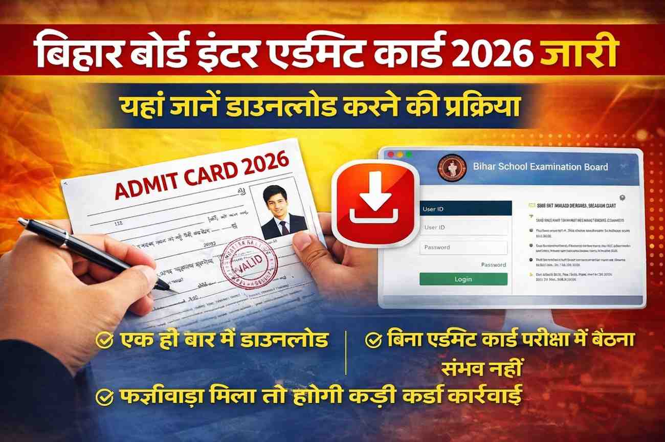 Bihar Board 12th Admit Card 2026 : बिहार विद्यालय परीक्षा समिति (BSEB) ने इंटरमीडिएट वार्षिक परीक्षा 2026 में शामिल होने वाले छात्रों के लिए एक महत्वपूर्ण अपडेट जारी किया है। बोर्ड द्वारा इंटर परीक्षा 2026 का प्रवेश पत्र जारी कर दिया गया है, जिसे स्कूल स्तर से डाउनलोड कर छात्रों को उपलब्ध कराया जाएगा।
