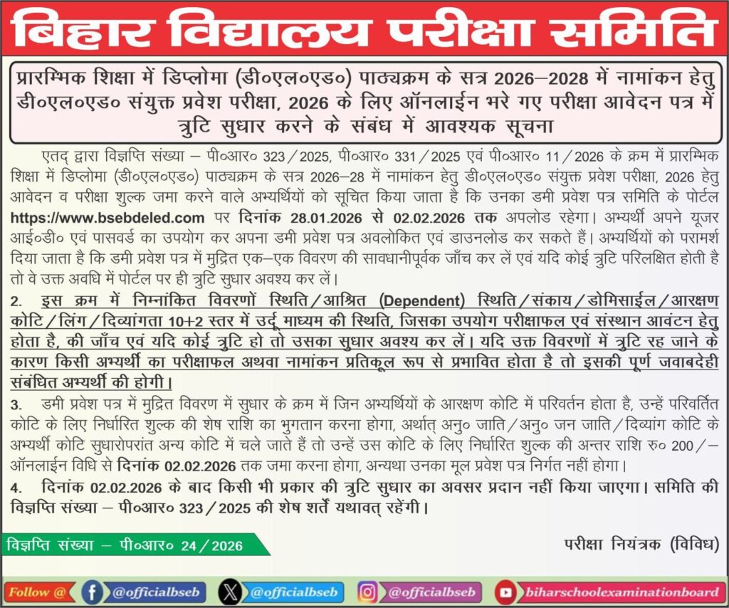 इस प्रकार आप आसानी से Bihar Deled Dummy Admit Card 2026 डाउनलोड कर उसमें आवश्यक सुधार कर सकते हैं।